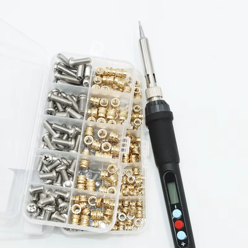 1 × مكواة لحام رقمية | 8 × رؤوس توجيه نحاسية | 130 × مسمار ستانلس ستيل M4 (أطوال متنوعة) | 130 × صامولة نحاسية حرارية M4 (أطوال متنوعة) | 1 × صندوق تخزين منظم