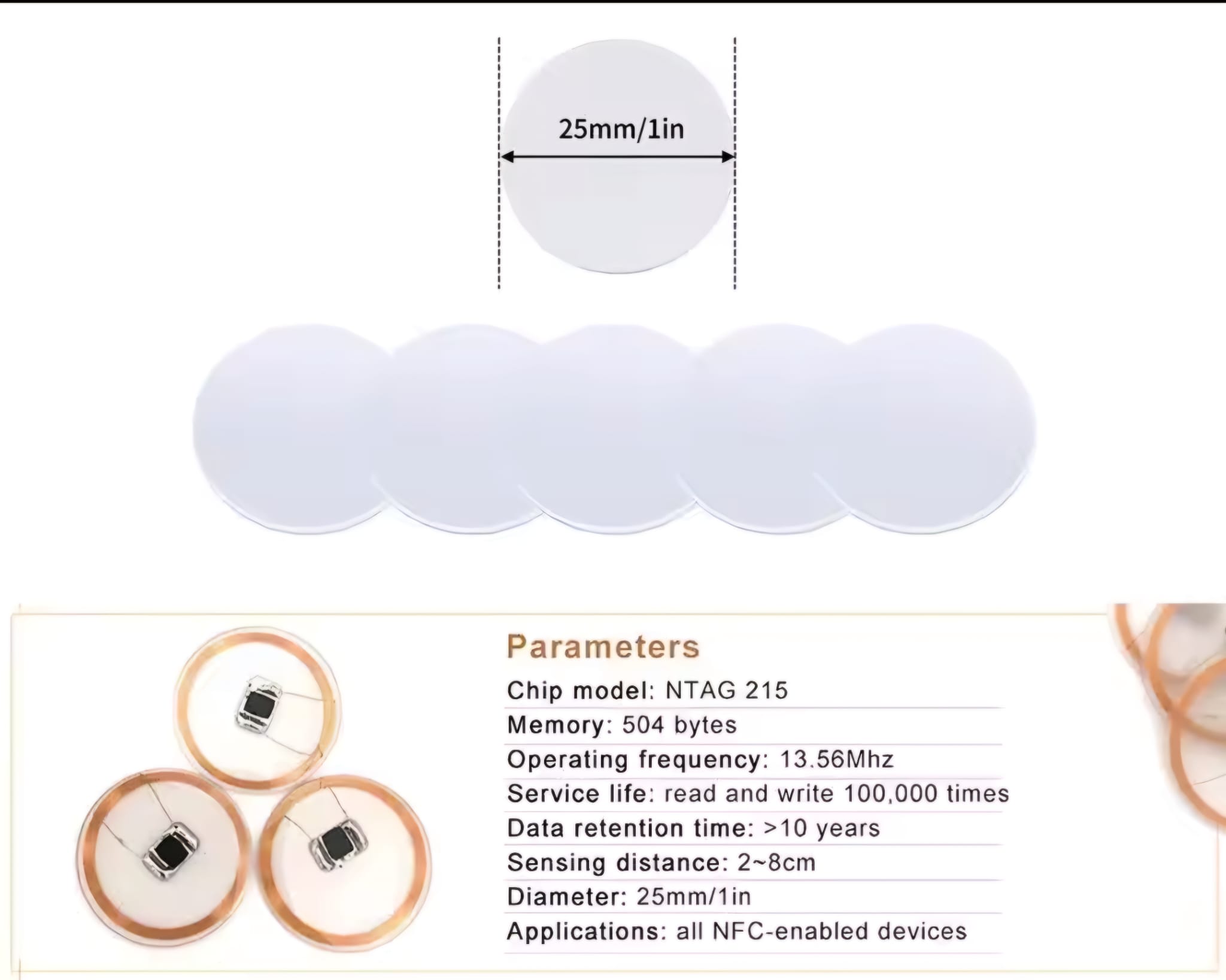 ملصق NFC NTAG215 هو شريحة عالية الاعتمادية، مصممة خصيصًا للتطبيقات الذكية الكلاسيكية ثلاثية الأبعاد، خاصة مع الطباعة . يأتي بقطر 25 مم (1 بوصة) وسمك رفيع، ما يجعل من السهل دمج المجسمات المتخصصة دون التأثير على الشكل أو المتانة.